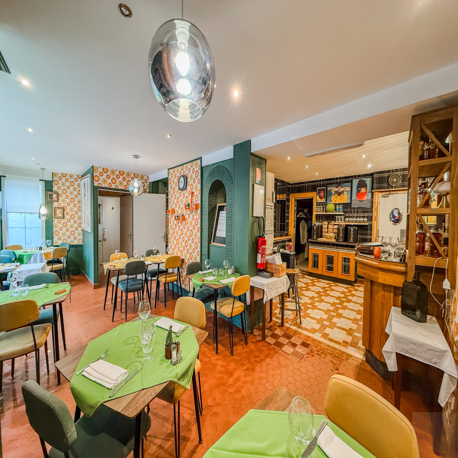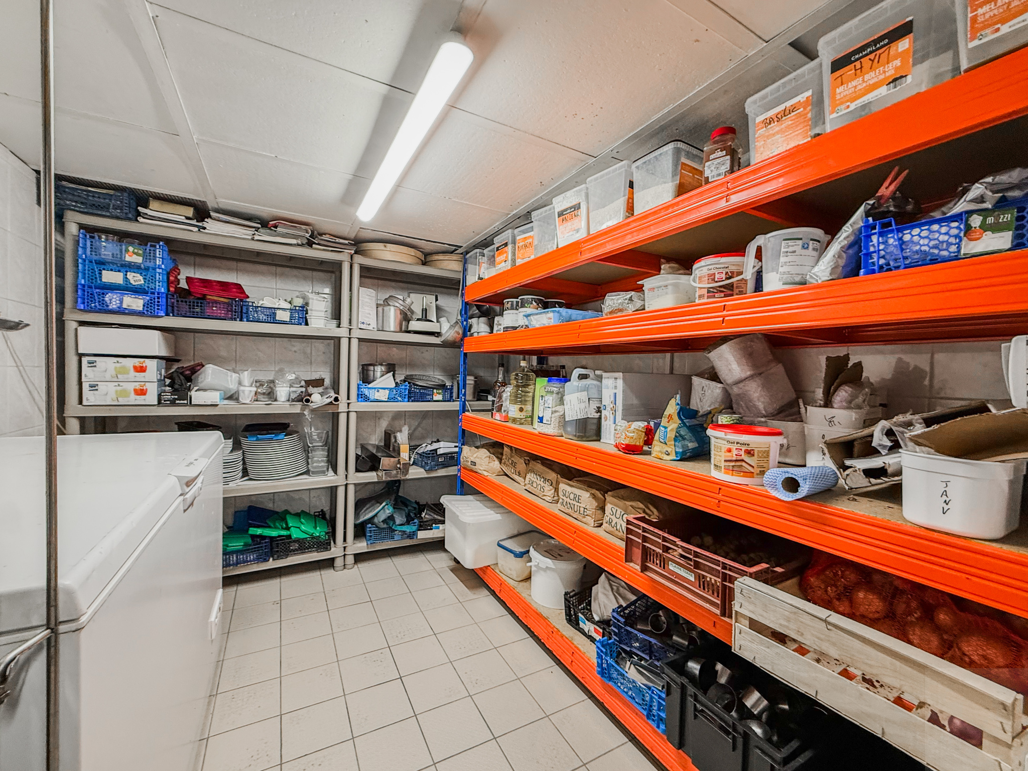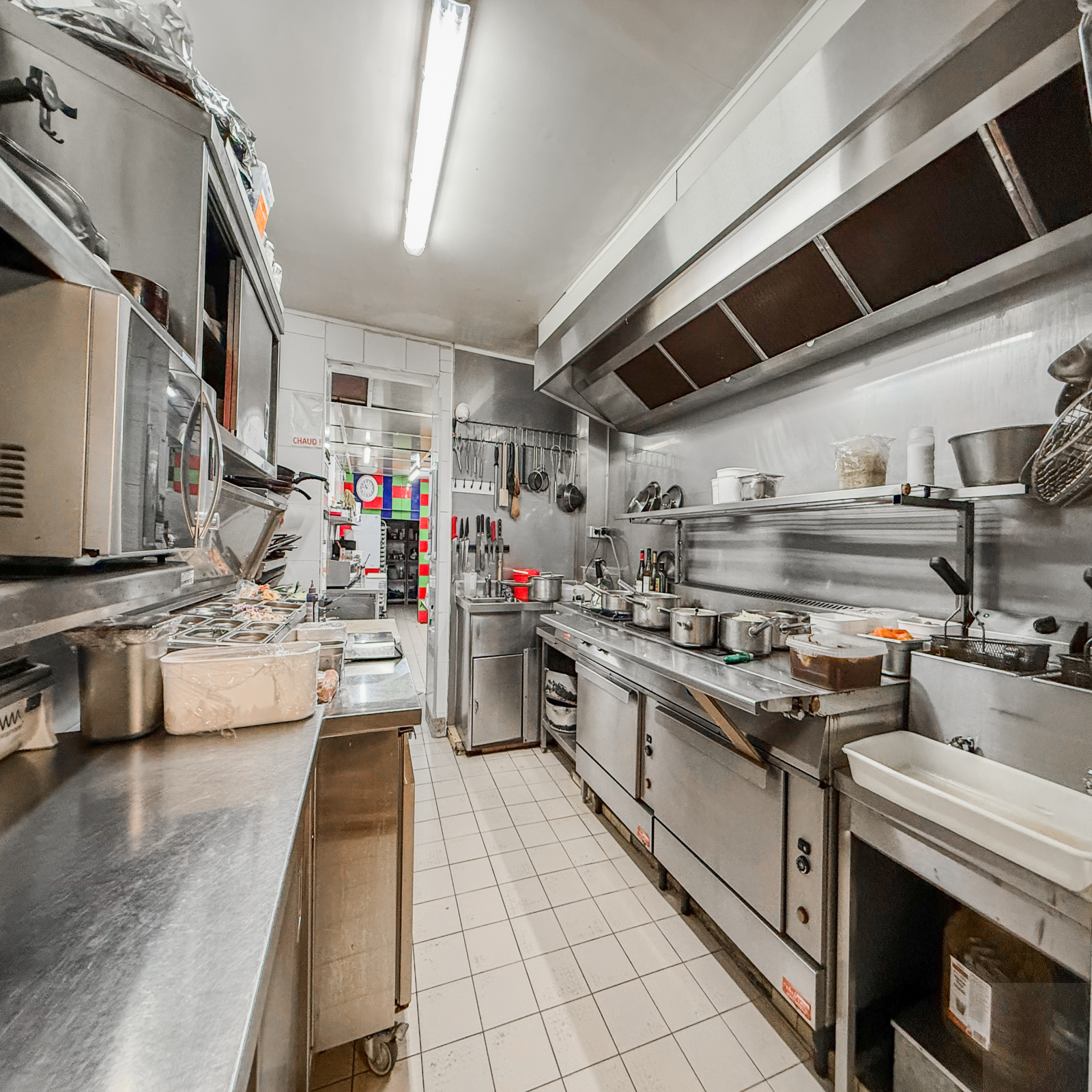 Rez-de-Chaussée : partie restauration : deux salles de réception, espace caisse, cuisine professionnelle entièrement équipée en excellent état avec qu'un WC séparé avec lave main