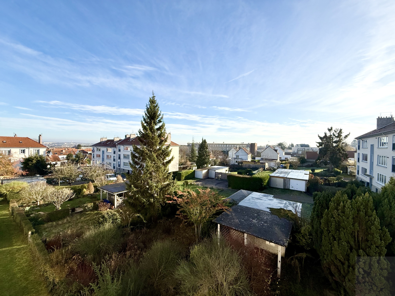 Extérieur : un balcon, un jardin clos et arboré puis un garage fermé.