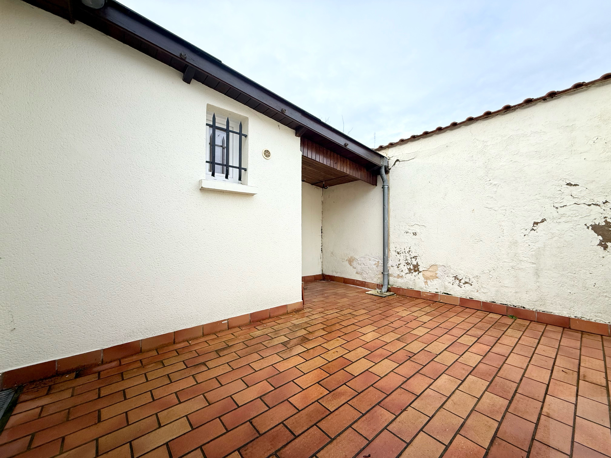 À l’extérieur : une cour avec une dépendance ouverte