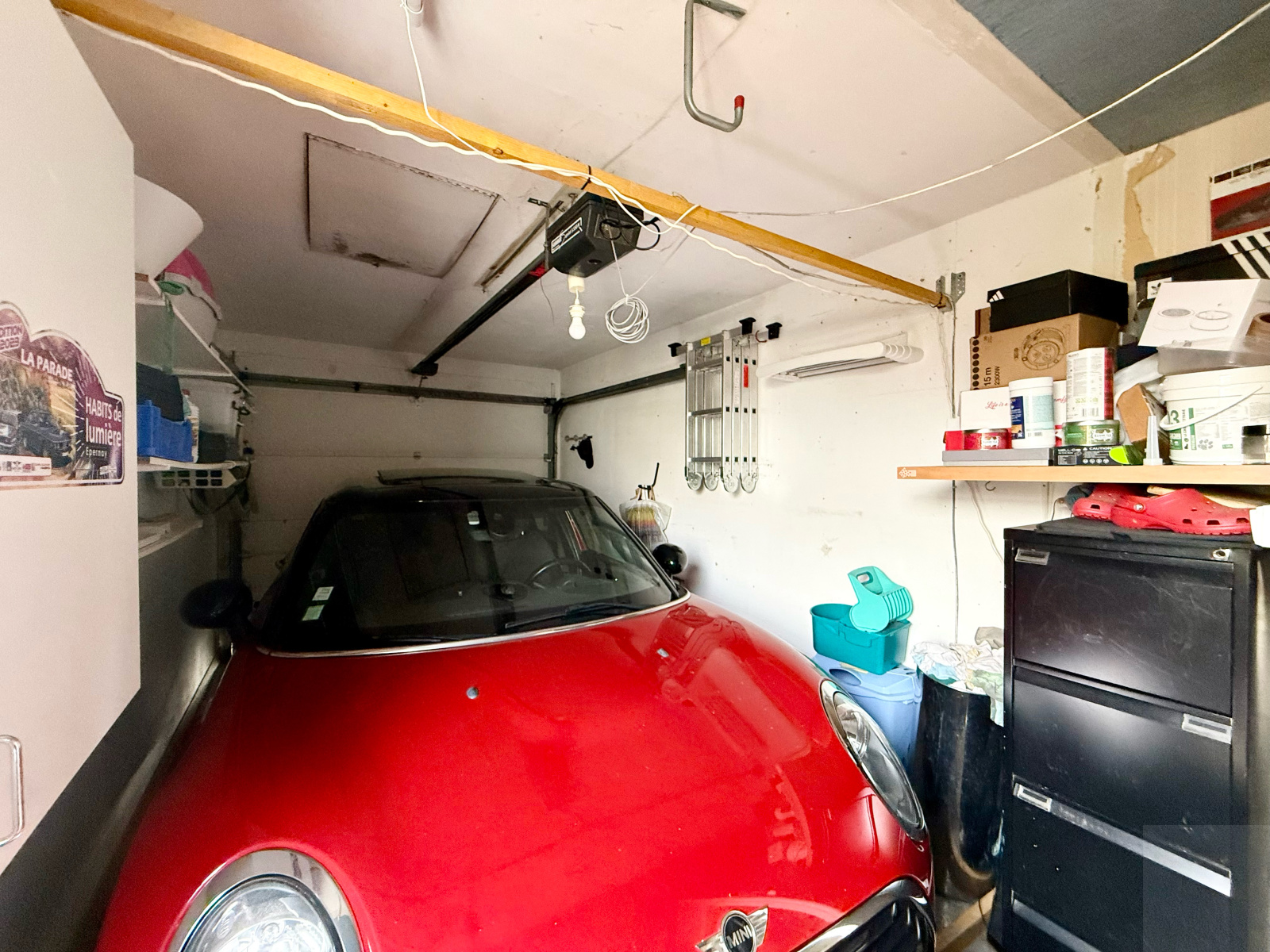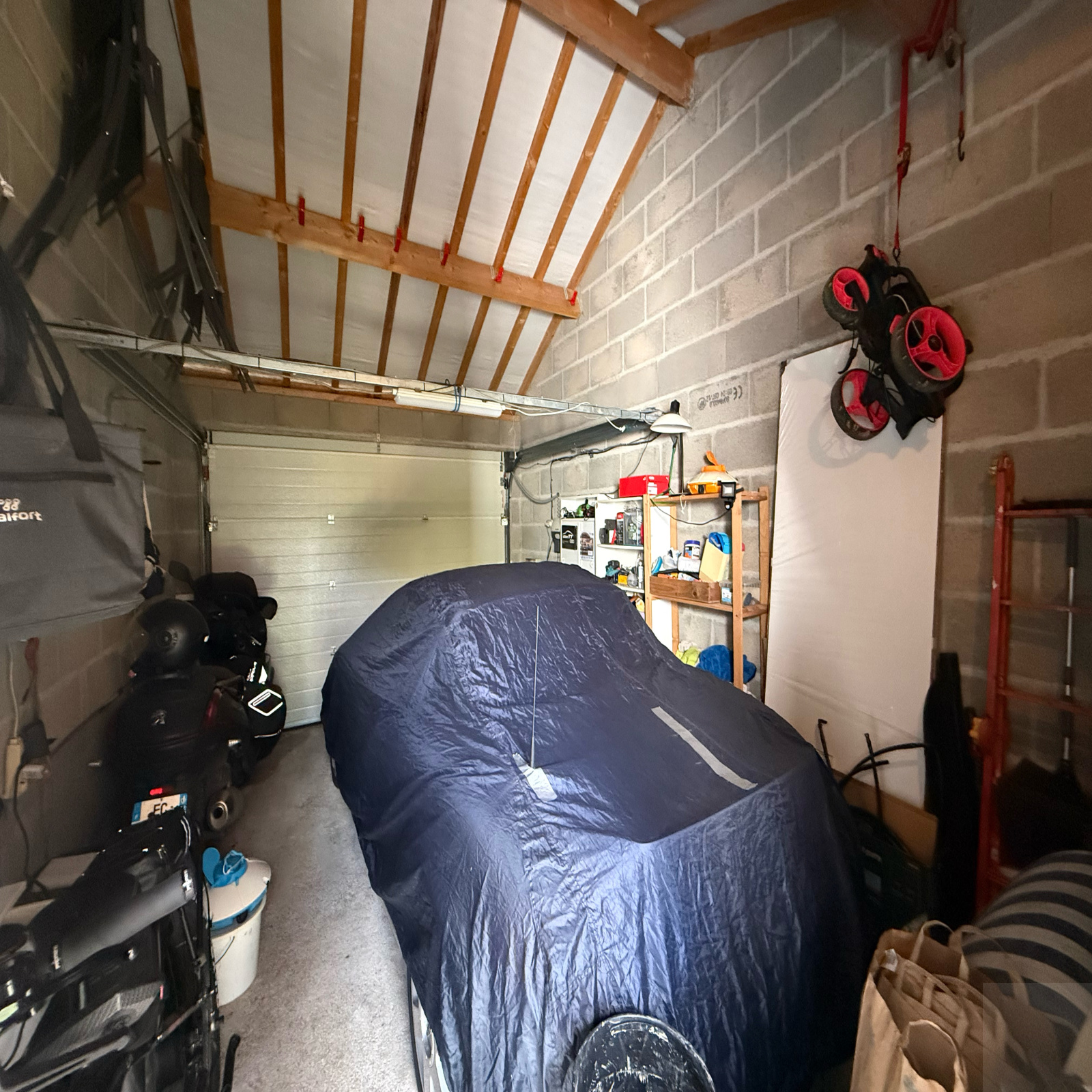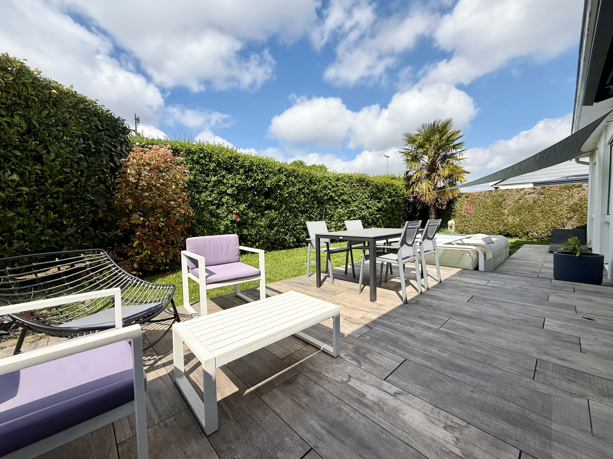 A l'extérieur : un jardin clos et arboré de 427m², deux garages, et une terrasse en carrelage sur plot, aucun vis à vis