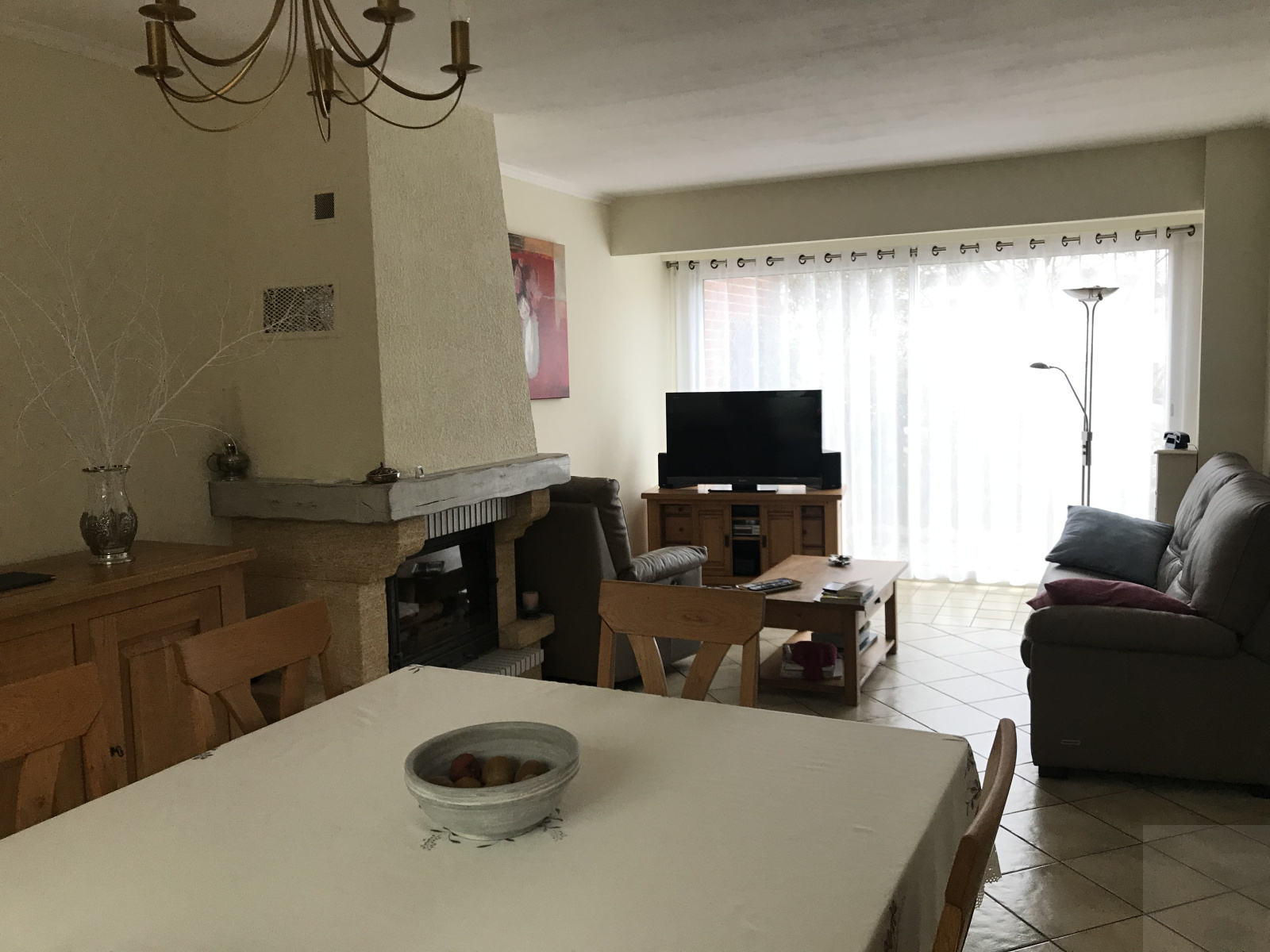 Au RDC : entrée avec vestiaire, WC indépendant, salon / salle à manger avec cheminée, cuisine équipée aménagée et véranda d'environ 16 m²,
