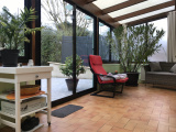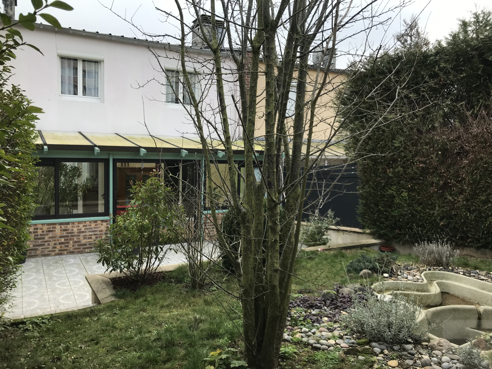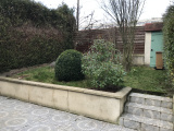 Jardin clos et arboré avec une terrasse d'environ 25 m² et garage,