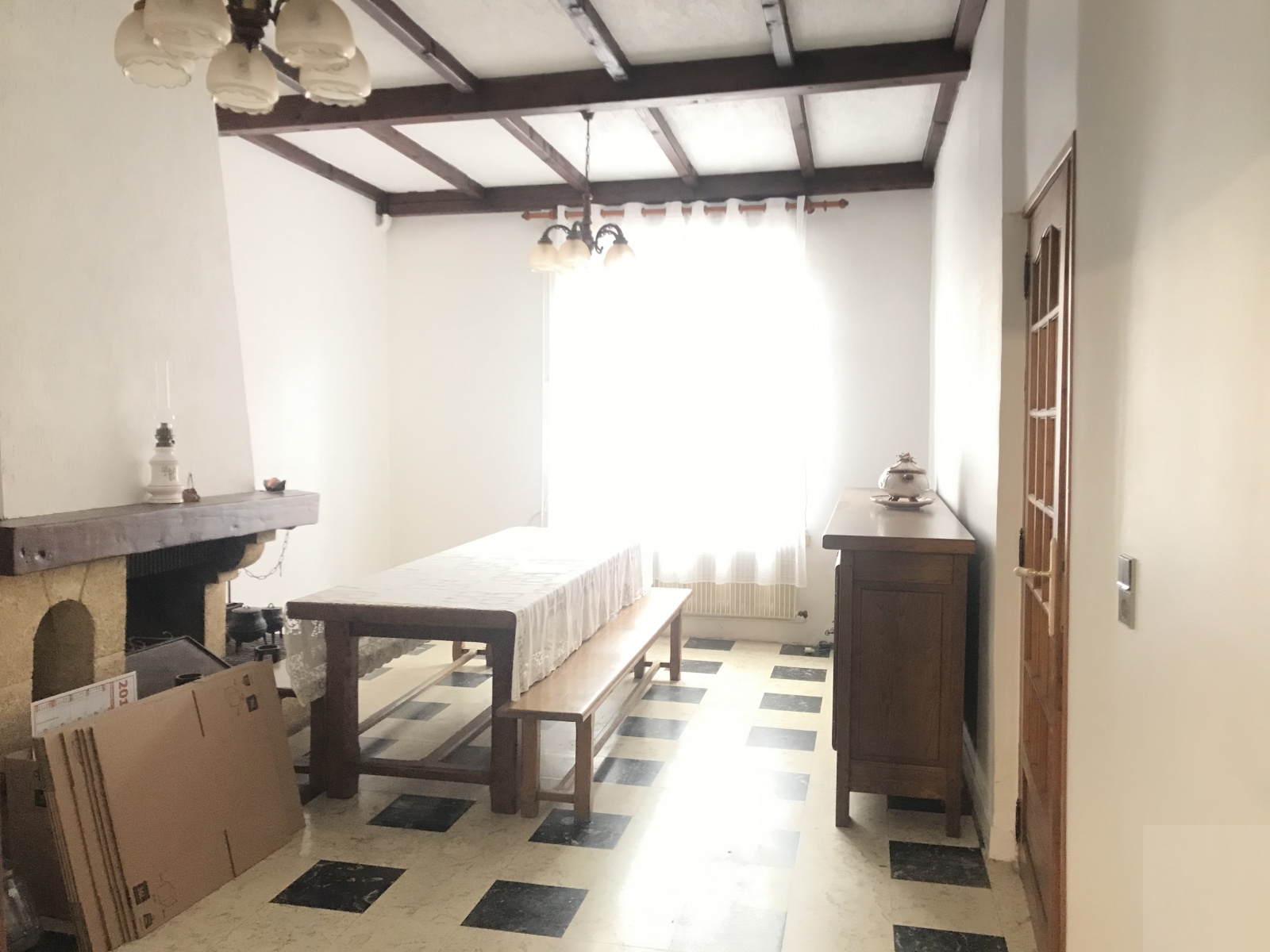 Au RDC : entrée, salon / salle à manger avec cheminée, cuisine, salle de bain, WC indépendant,