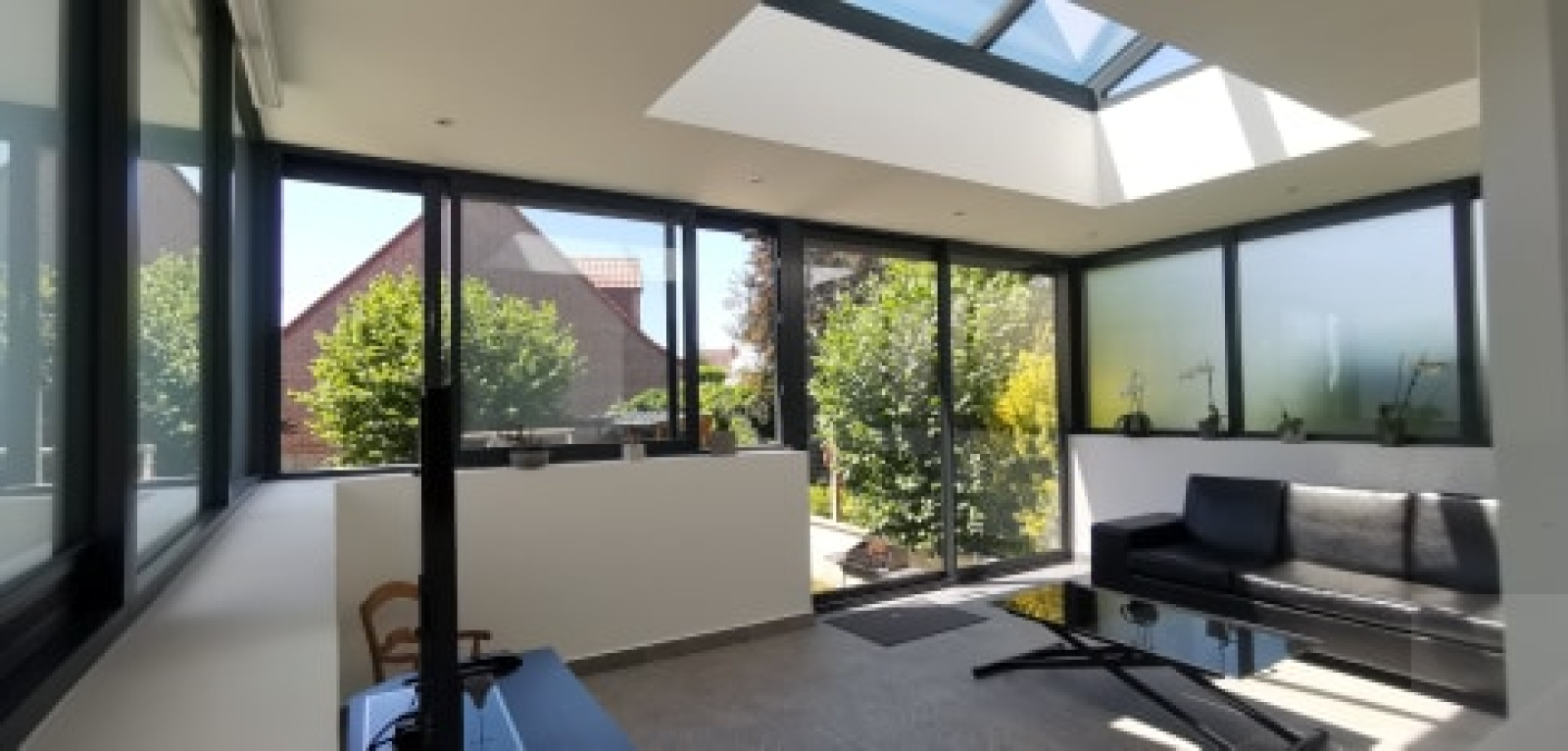 au rez de chaussée : une entrée, une cuisine aménagée équipée ouverte sur un séjour avec cheminée, véranda haute gamme avec puit de lumière, un WC séparé