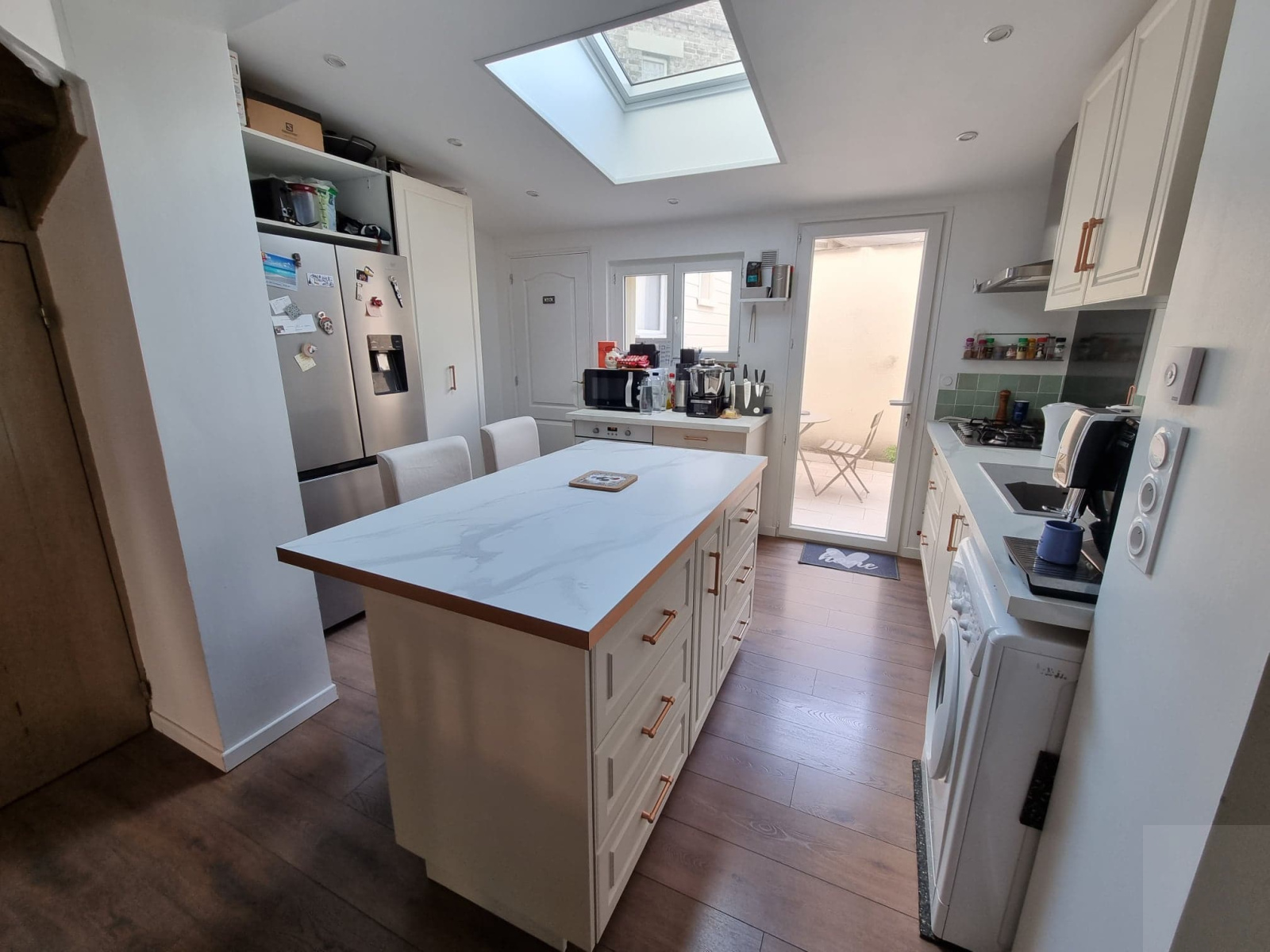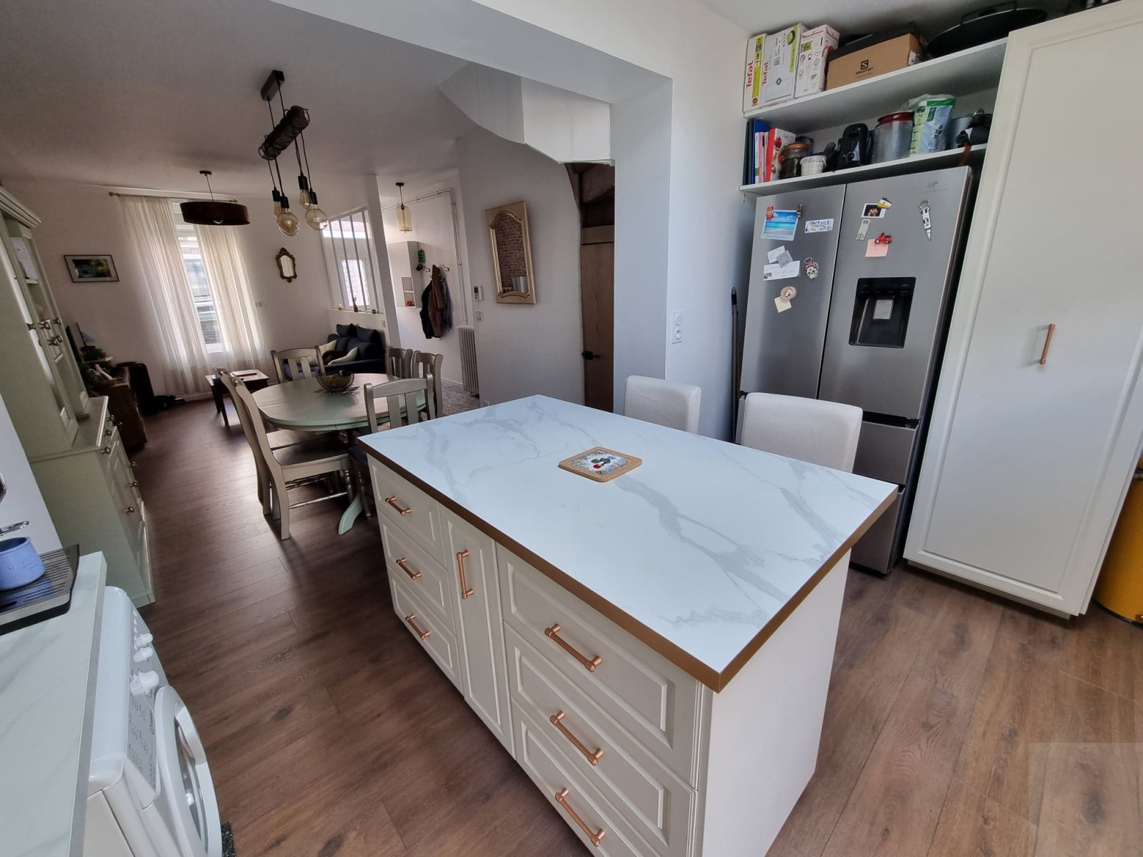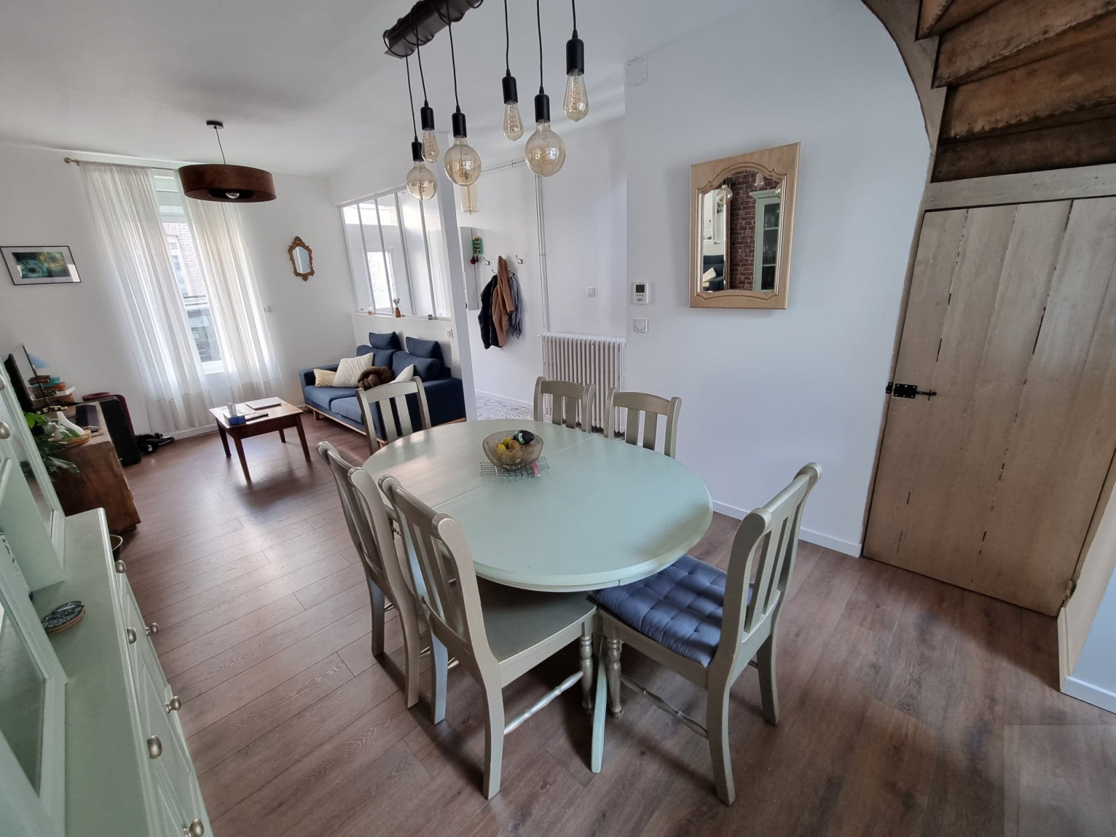 - Au rez-de-chaussée : un couloir d'entrée avec une verrière d'artiste, un séjour, une salle à manger, une cuisine entièrement équipée avec un coin repas sur îlot central, une salle de douche avec un WC