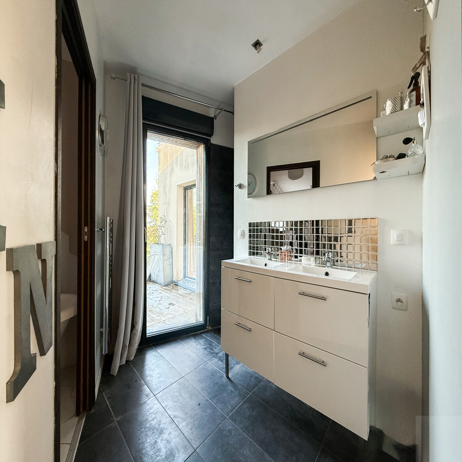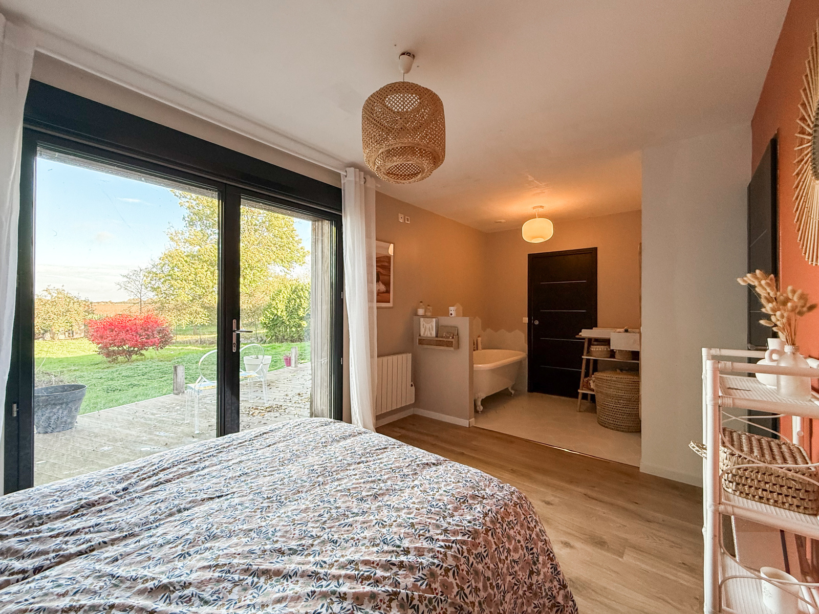 Extérieur : un jardin avec des arbres fruitiers, une terrasse et des places de parkings privatives