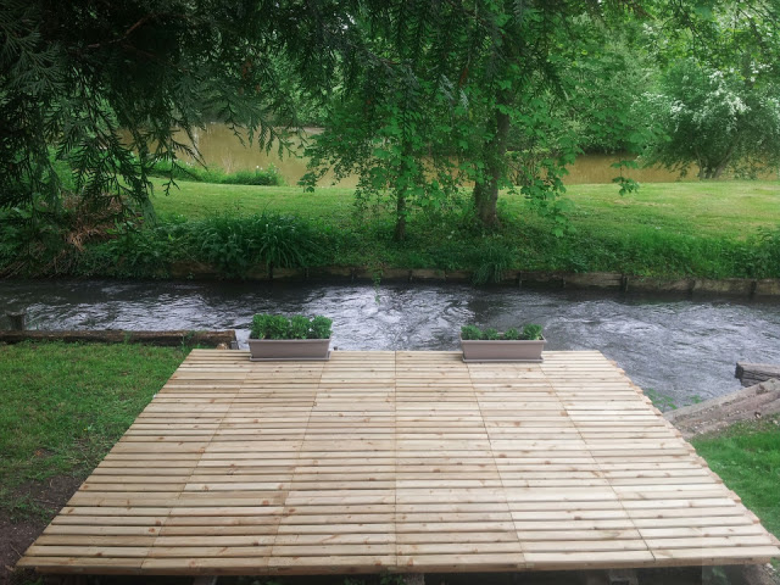 Garage 3 voitures, buanderie, cave, jardin clos et arboré de 1400 m² avec deux terrasses dont une face à la rivière.