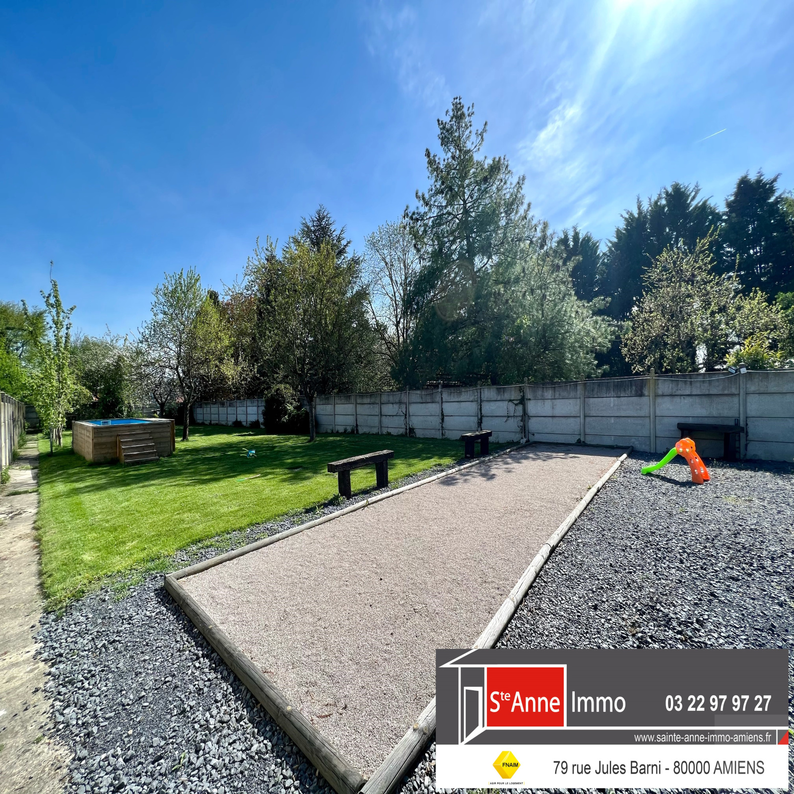 A l'extérieur : un jardin clos et arboré de 1417 m2, avec des dépendances, un garage, un terrain de pétanque, une piscine semi-enterrée 2x7 (13 m3) , une terrasse et une cave