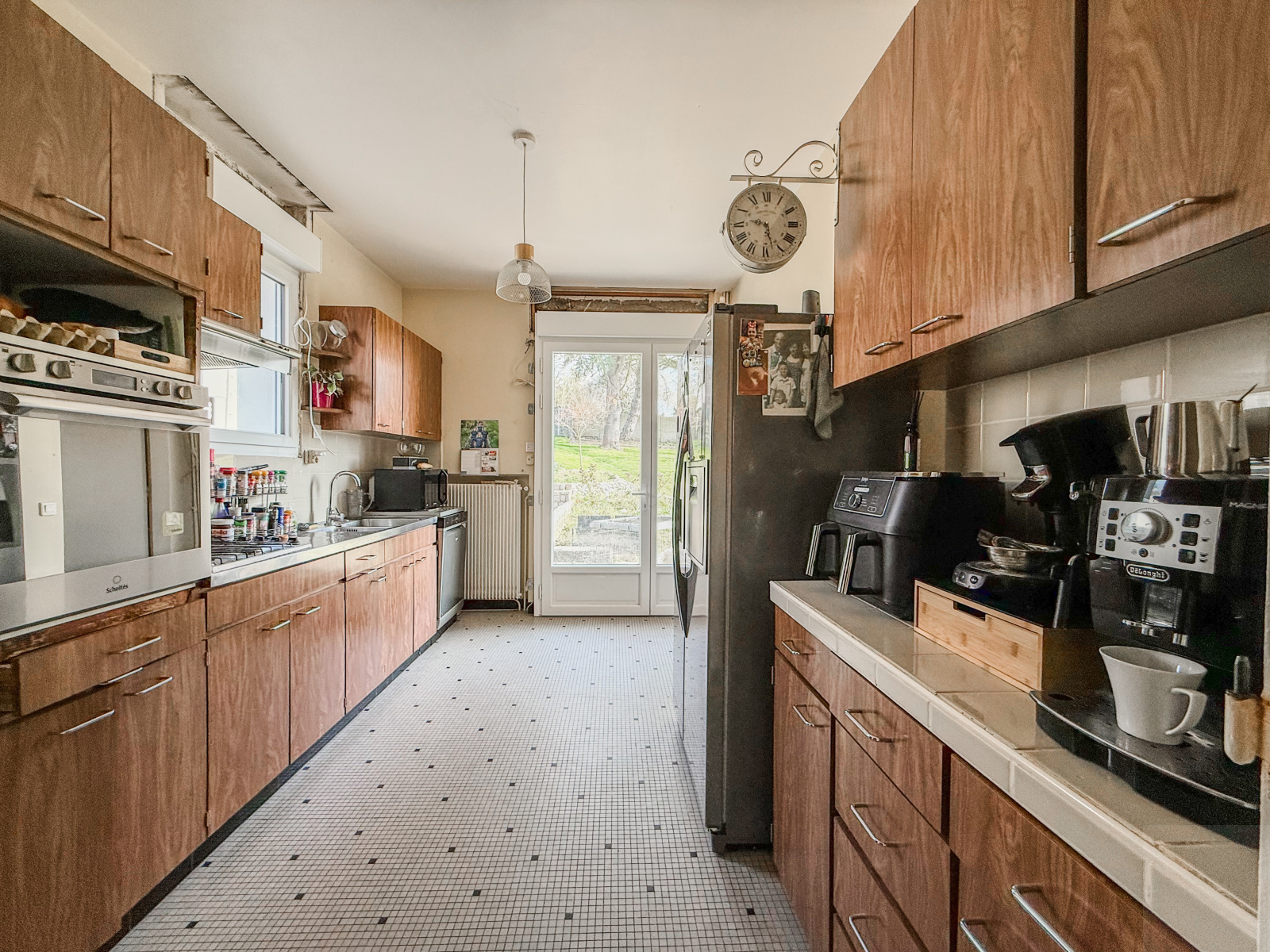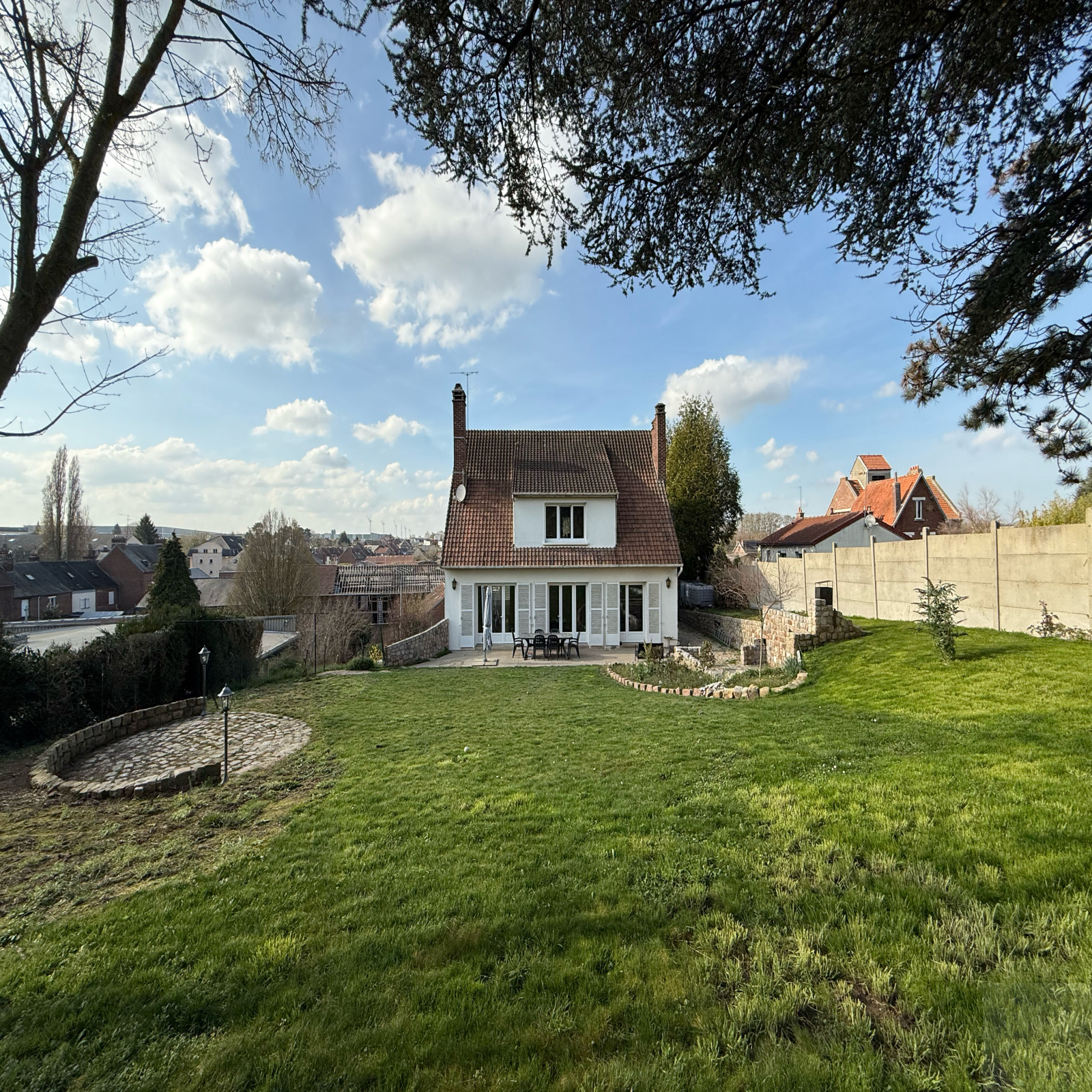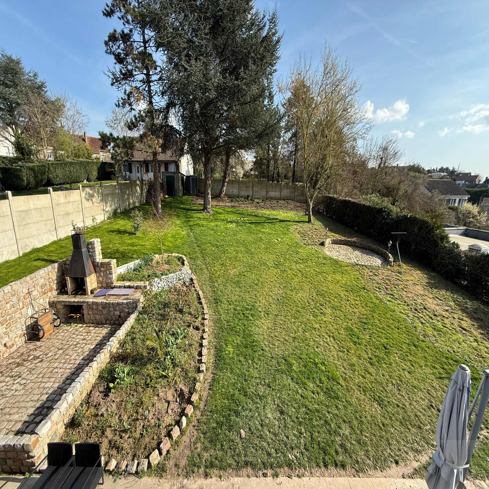 Extérieur : un jardin clos et arboré de 1360m² comprenant une cour en enrobée avec plusieurs places de parkings et deux terrasses
