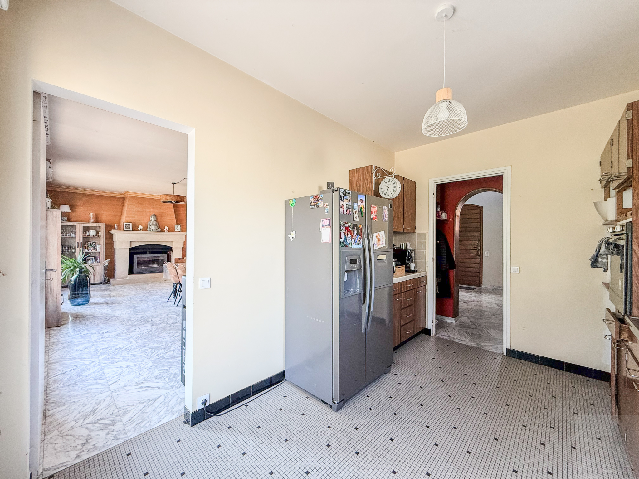 Rez-de-Chaussée : une entrée desservant une salle à manger (le tout carrelé en marbre), un salon, une cuisine équipée, aménagée, fermée avec un coin repas et un WC séparé avec lave main
