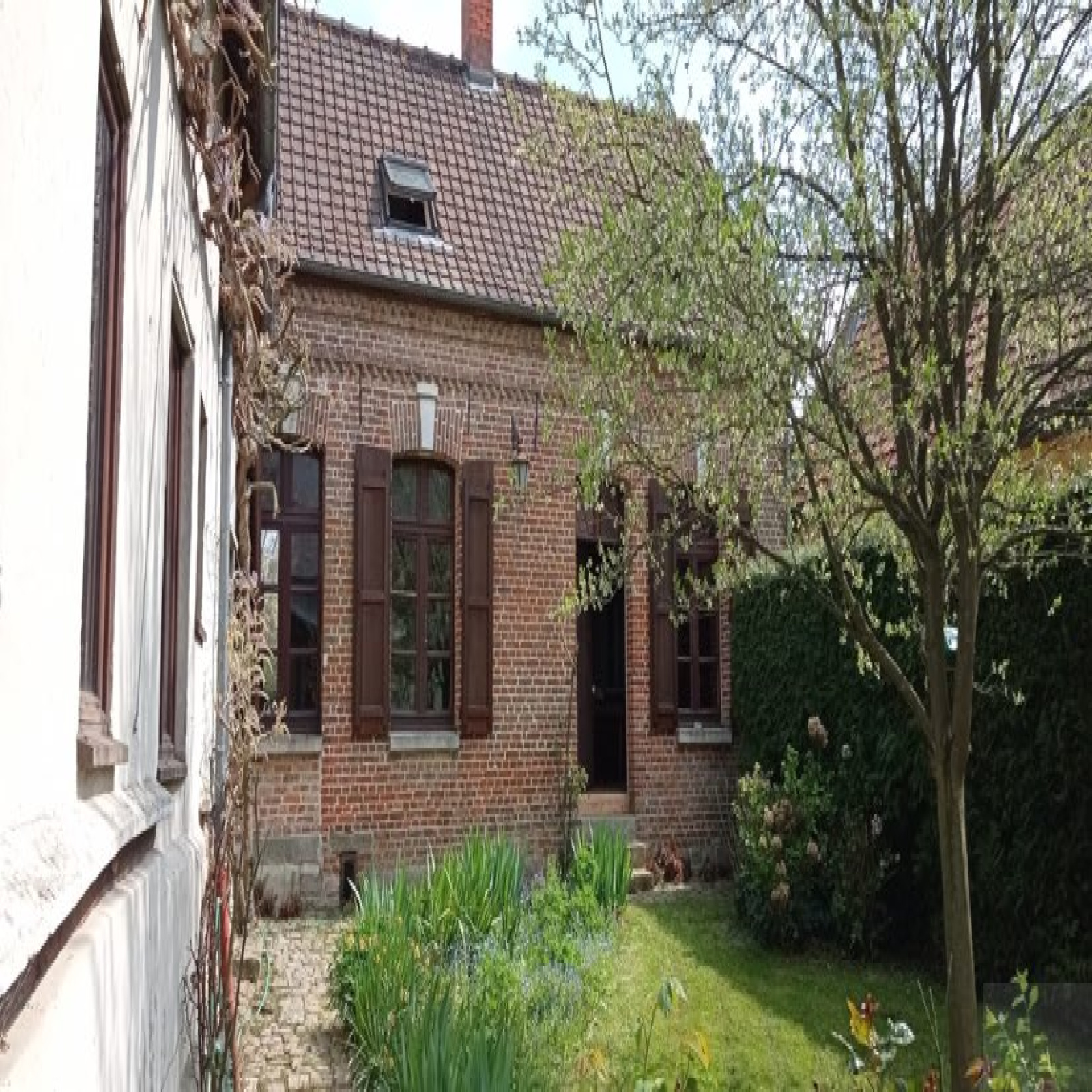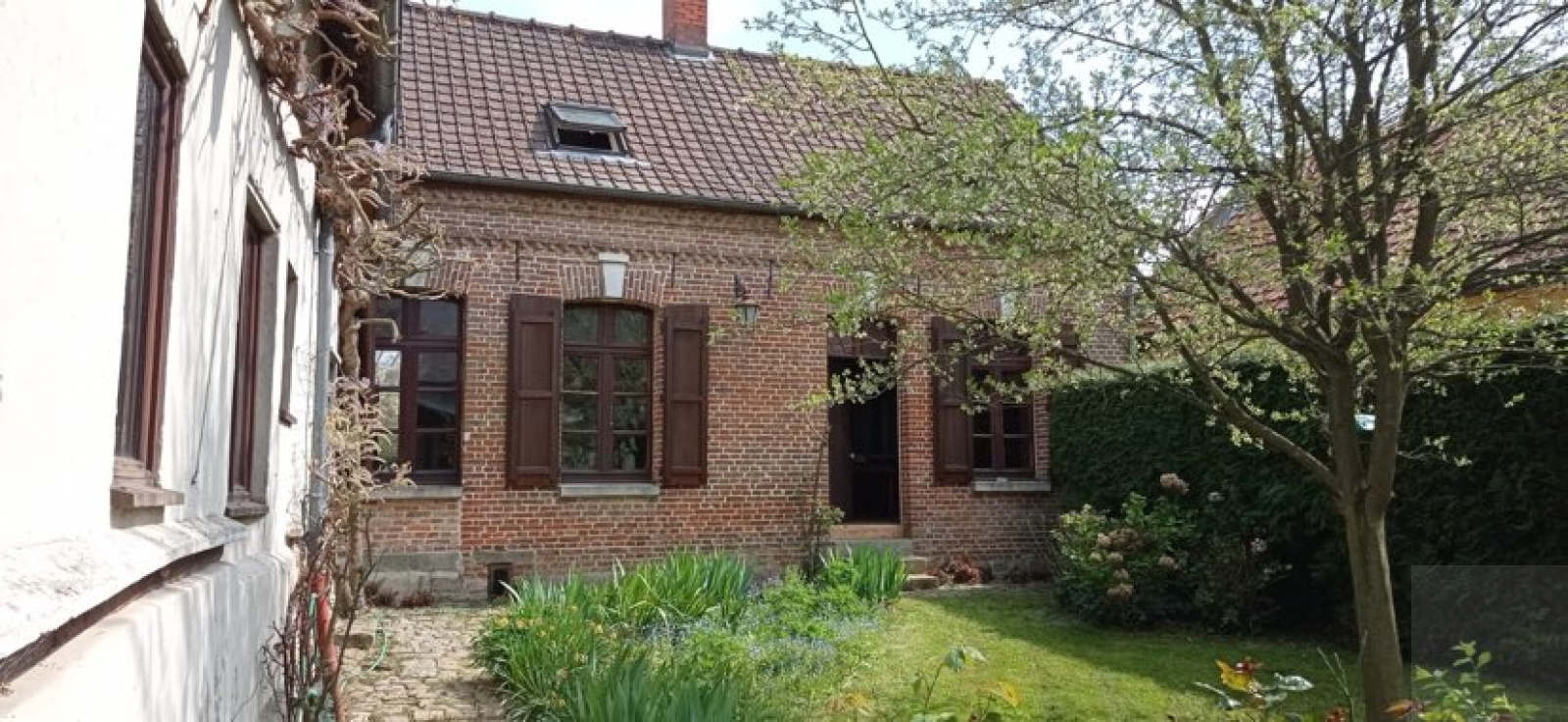 A l'extérieur : un jardin sans vis à vis de 800 m² environ, un garage et des dépendances ( grange avec porte cochère de 8 m² de hauteur, un bucher, un pigeonnier... )