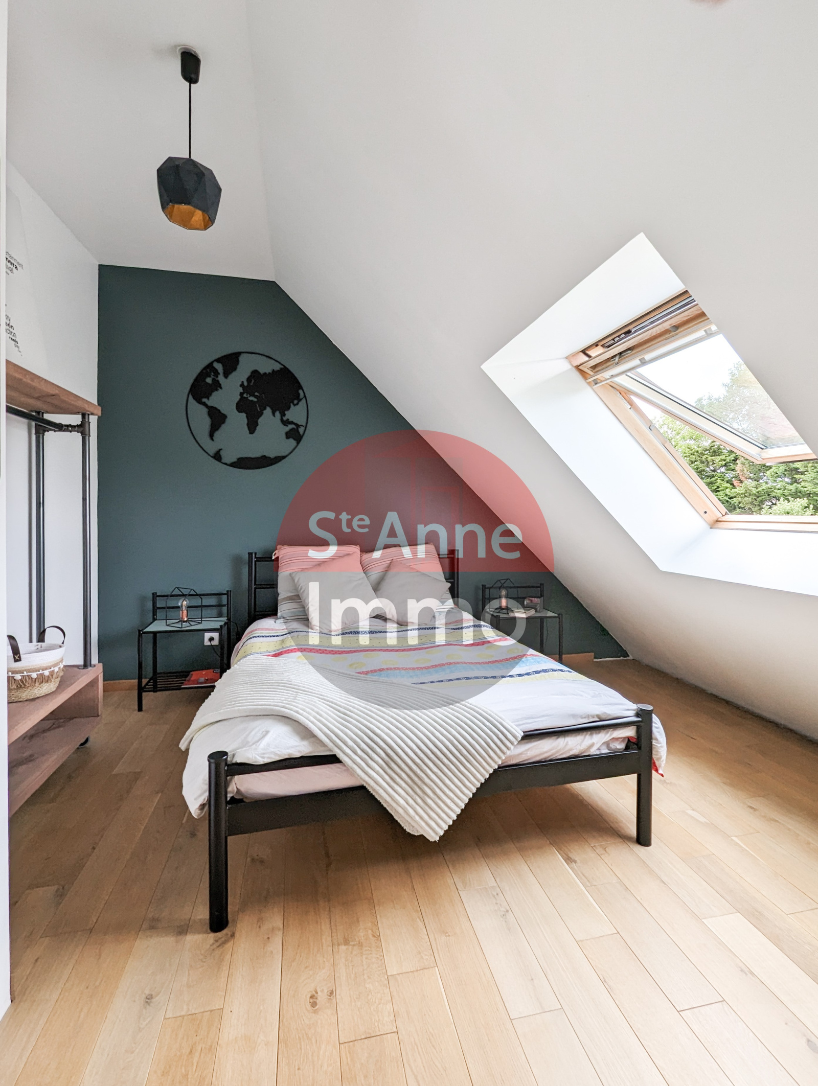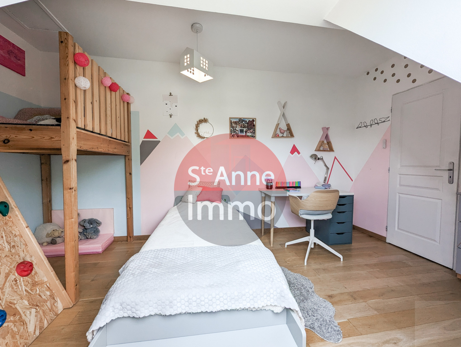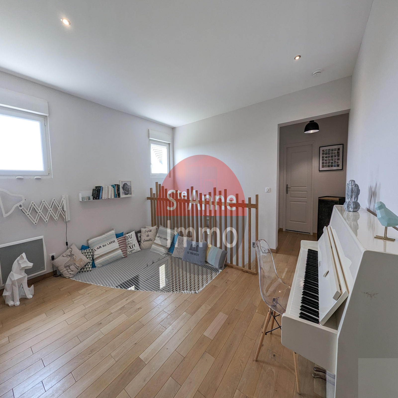 A l'étage: une mezzanine dessert 3 chambres, un grand bureau de 16m², un dressing-lingerie et une salle d'eau avec WC.
