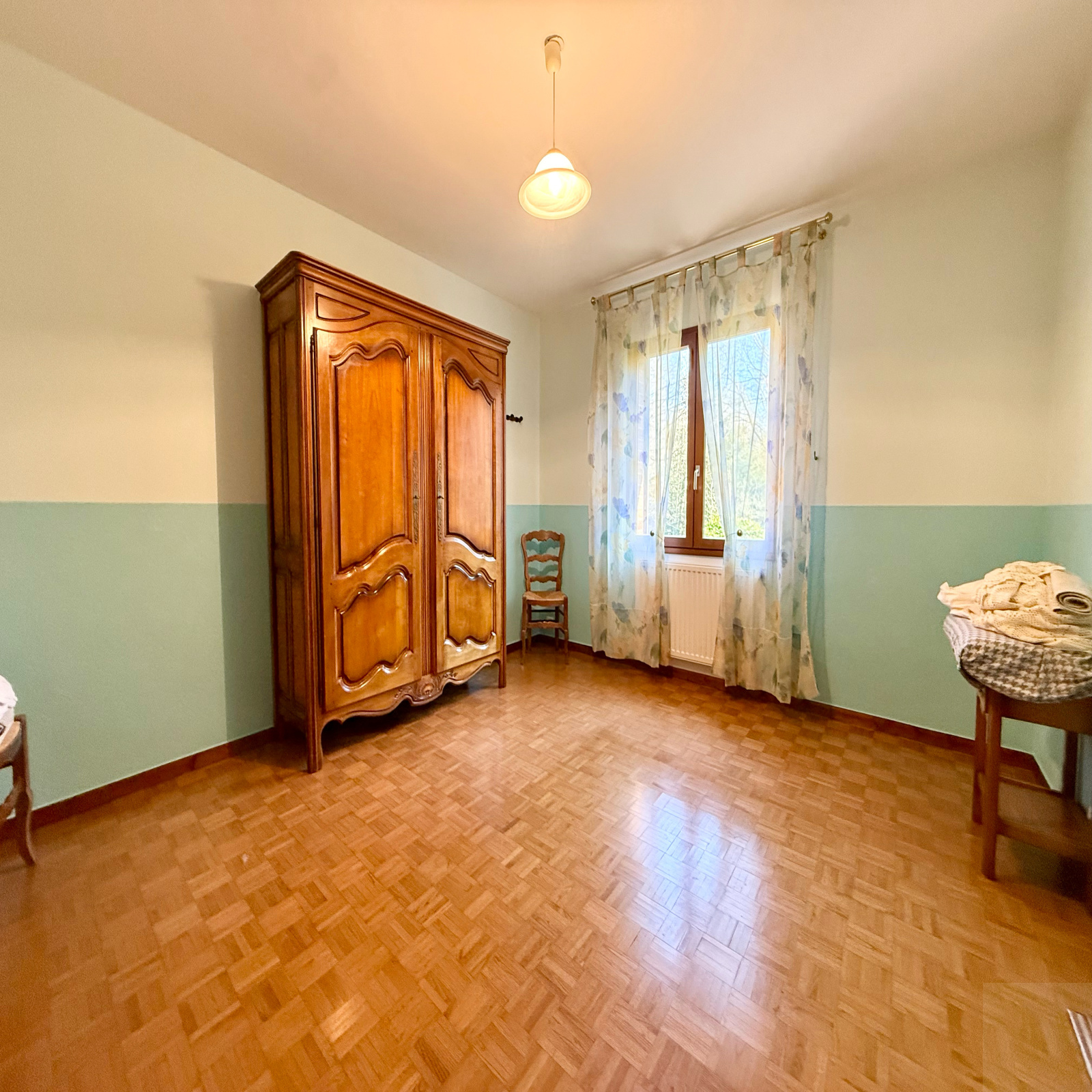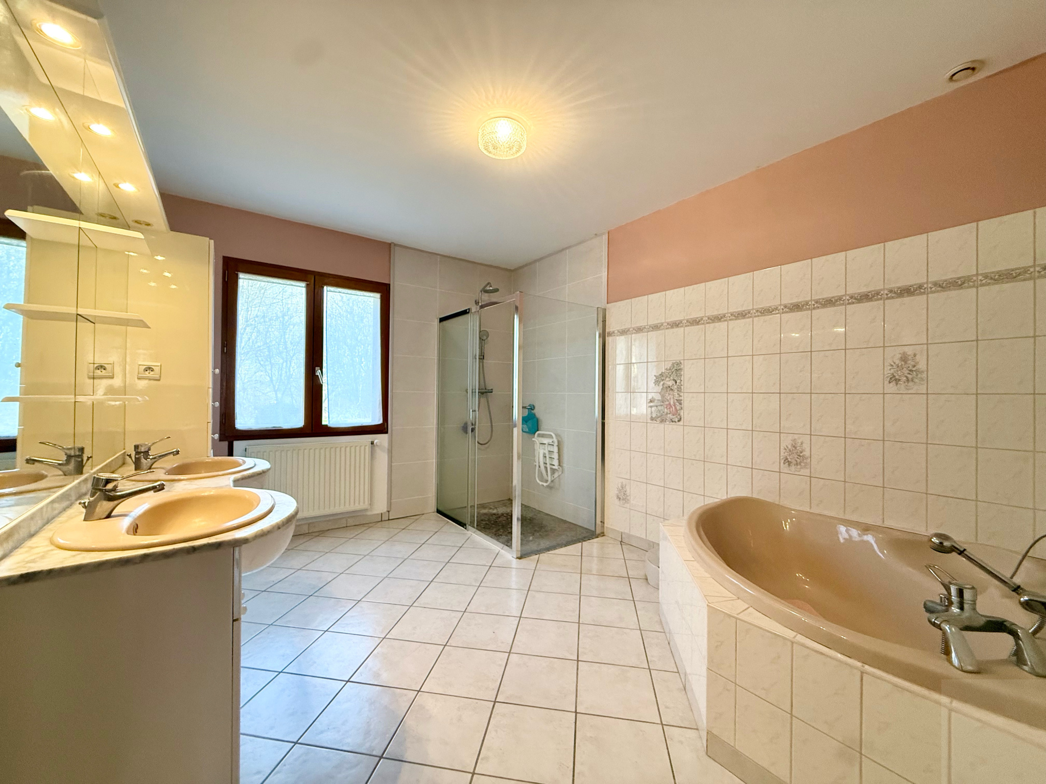 Au rez-de-chaussée : une entrée avec rangement, une cuisine séparée équipée aménagée avec coin repas, un salon/séjour, un couloir desservant deux chambres, un WC séparé et une salle de bain (baignoire, double vasque et douche à l'italienne)