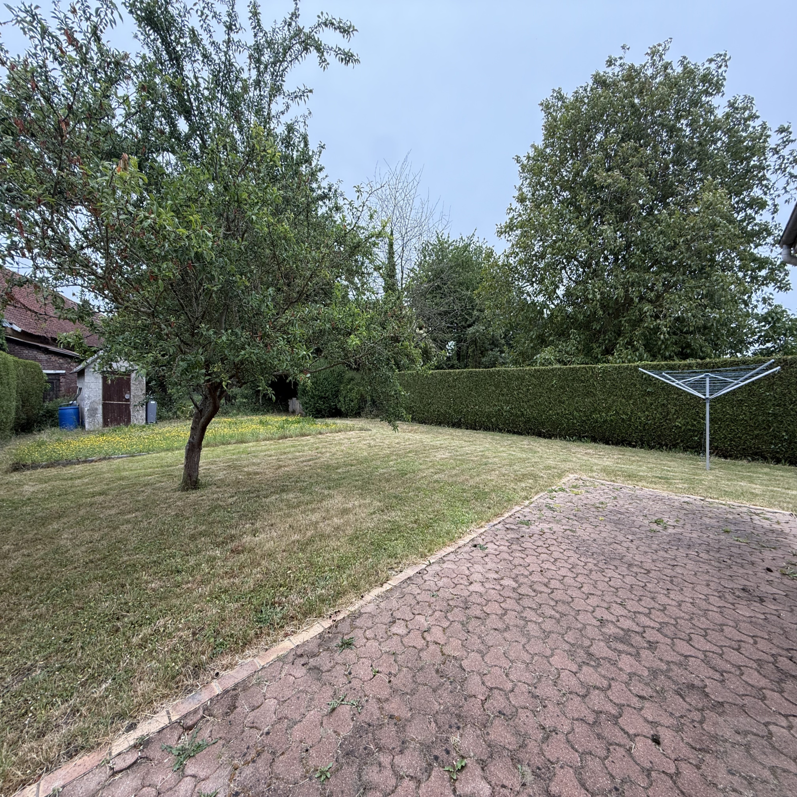A l'extérieur : un jardin clos et arboré de 761m², une terrasse et une allée en cailloux pour du stationnement privatif