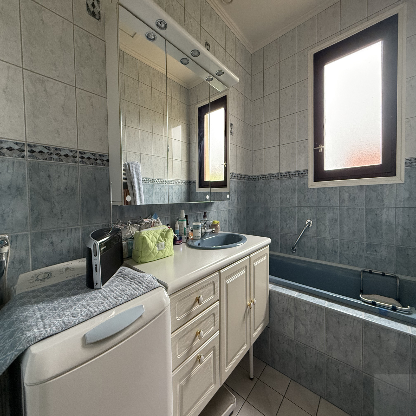Au rez-de-chaussée : une entrée avec des rangements, une cuisine séparé aménagée équipée avec coin repas, un salon/séjour, un couloir desservant une salle de bain avec espace buanderie, un WC séparé et deux chambres avec des rangements