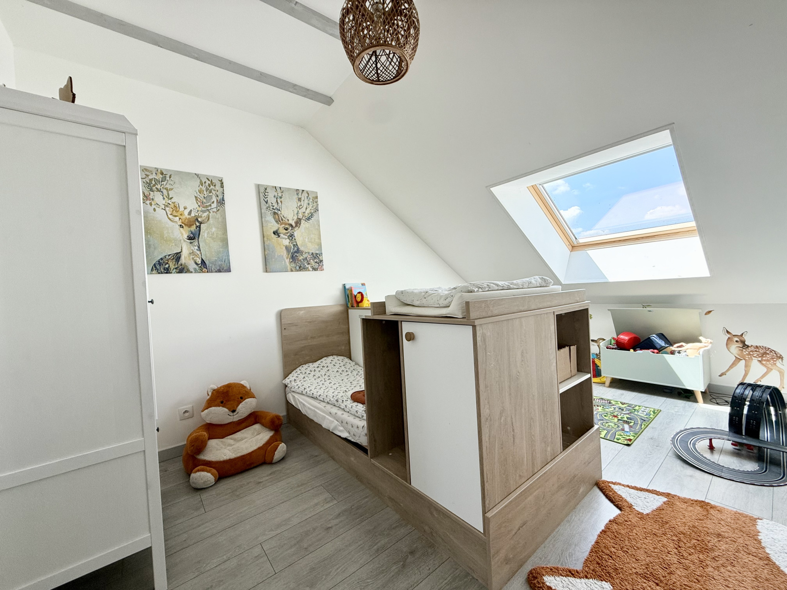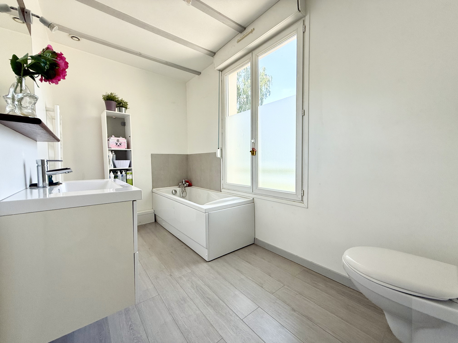 Je vous propose un pavillon individuel vivable de plain-pied avec étage et garage construit en 2012 de 135 m2 avec un jardin clos et arboré de 568 m2 comprenant :