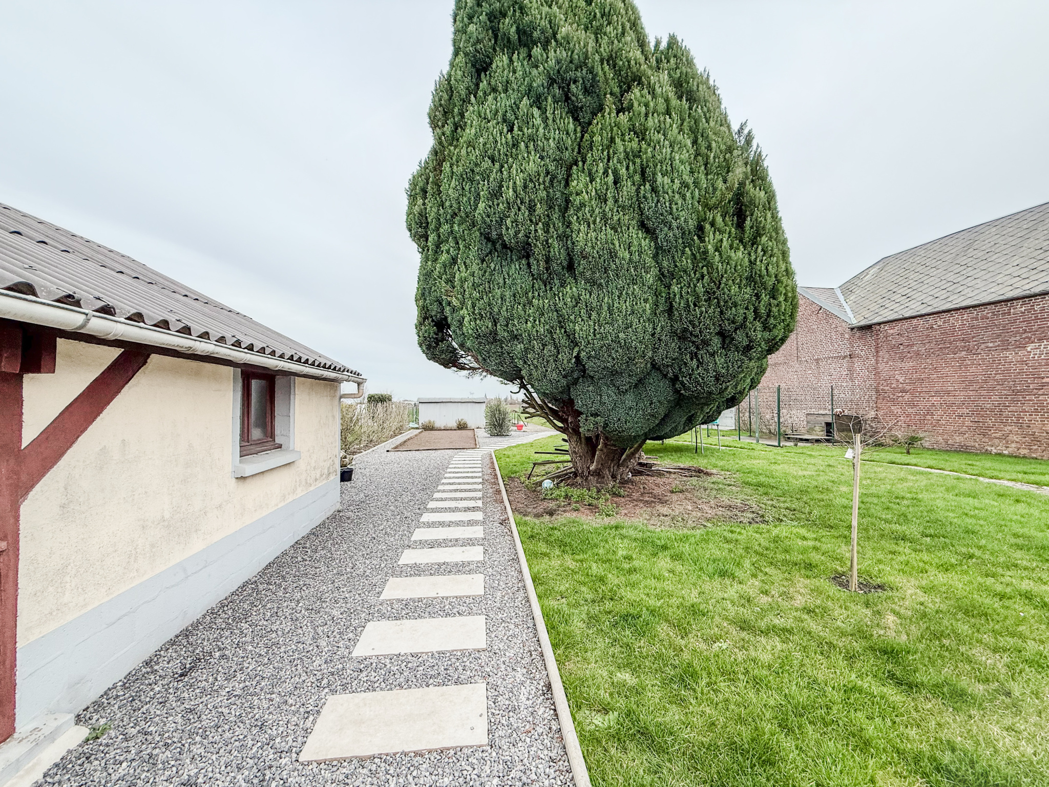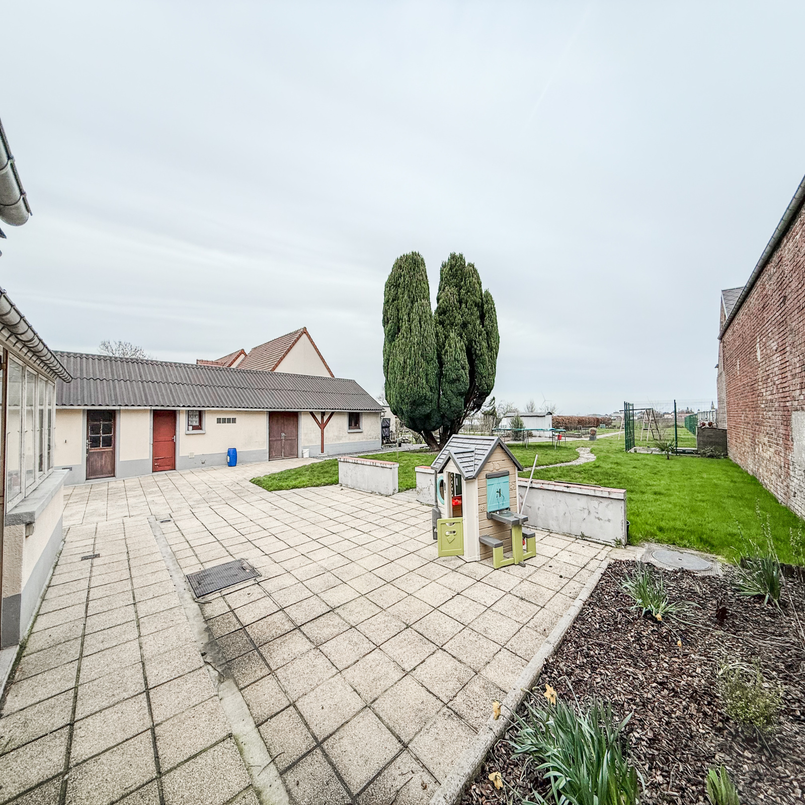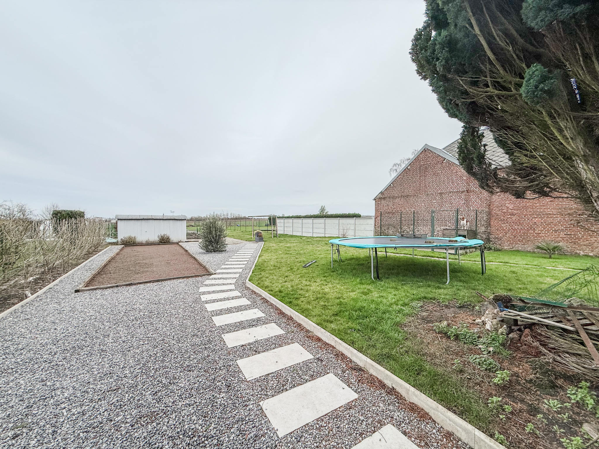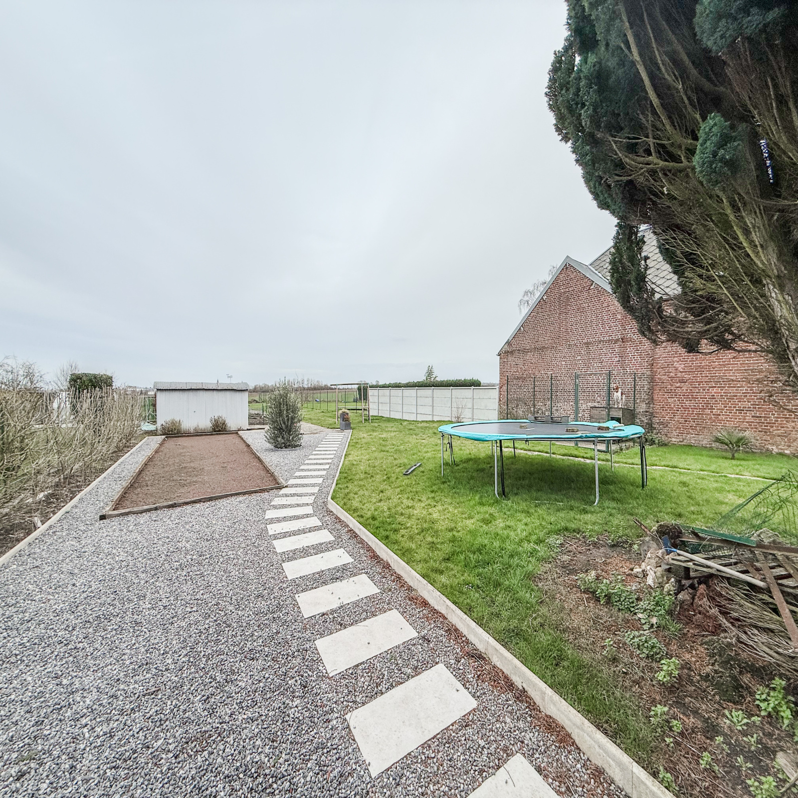 Extérieur : jardin clos et arboré comprenant une terrasse, un terrain de pétanque, des dépendances fermées et un garage