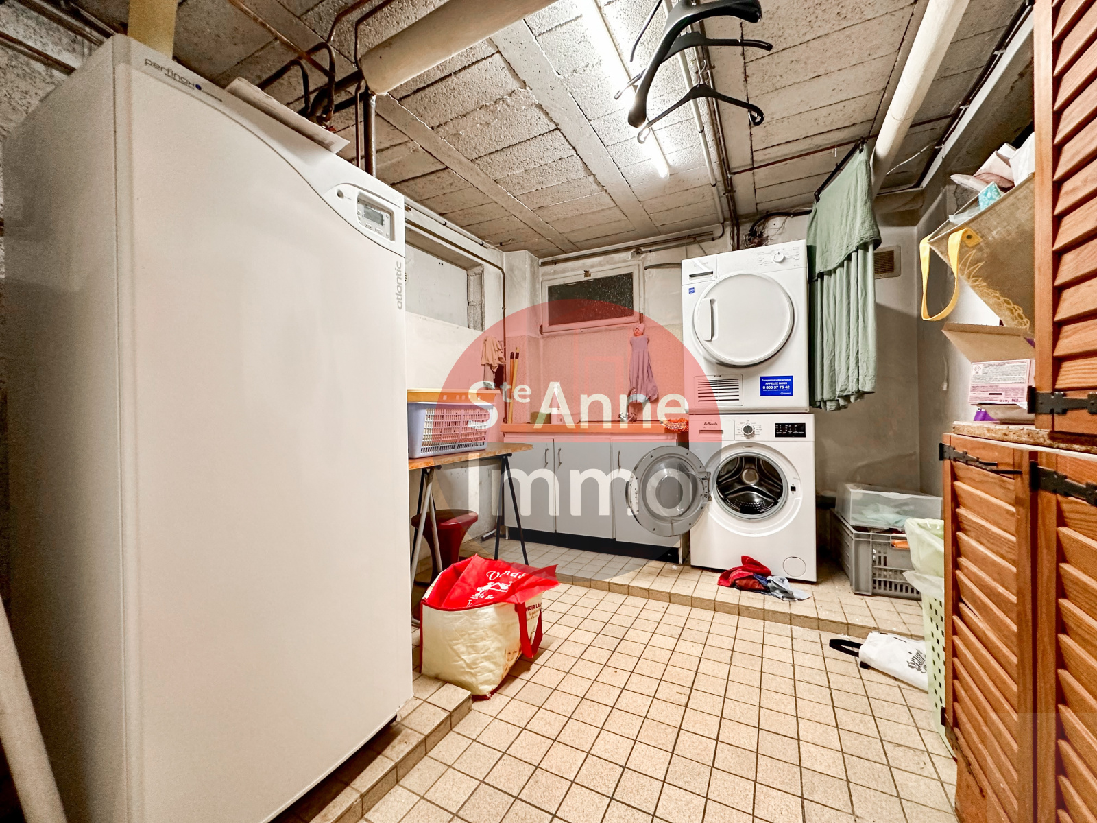 Sous-sol complet de 90 m² environ avec un garage, un atelier et une buanderie.