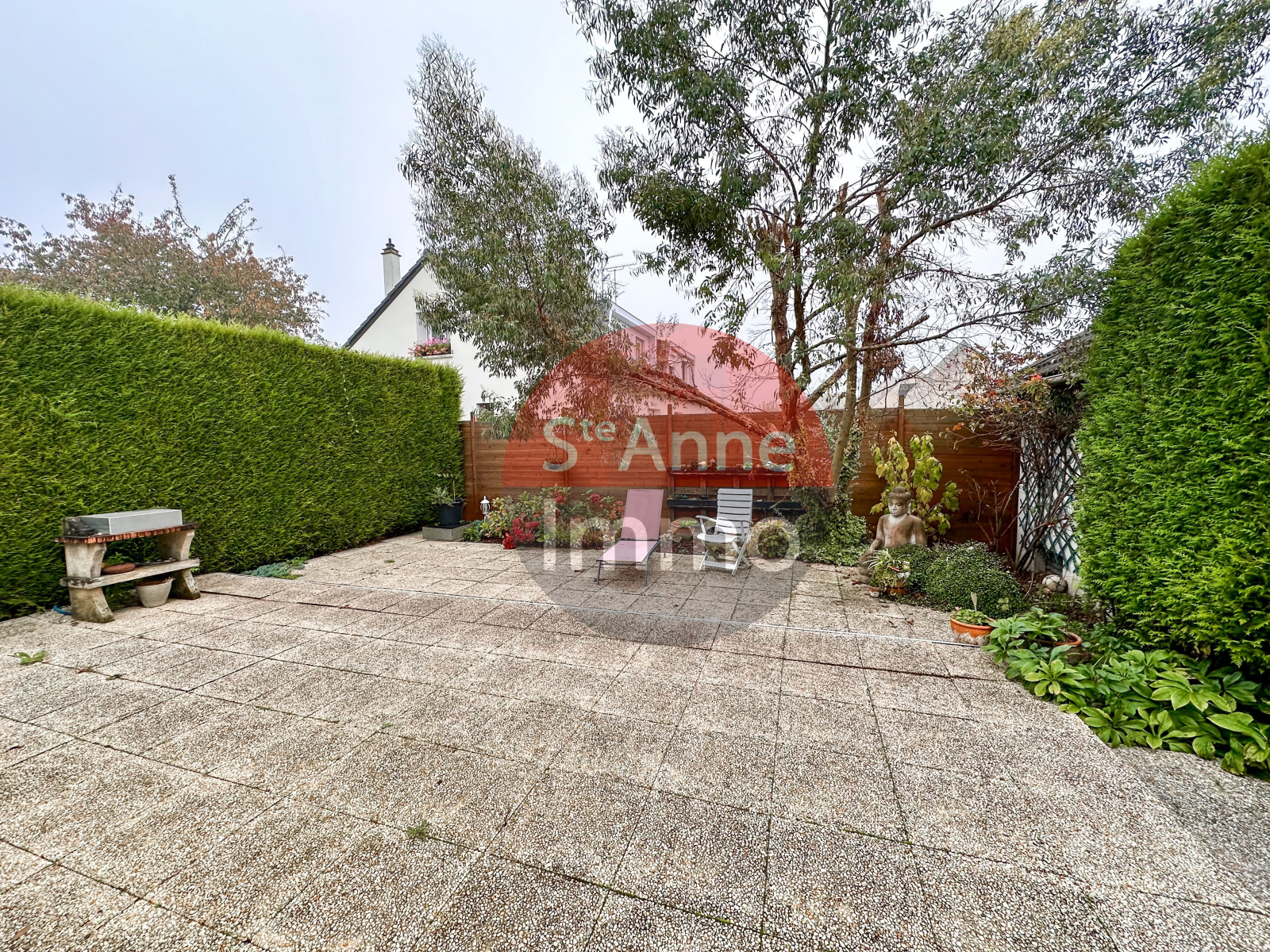 A l'extérieur : un jardin clos et arboré avec une terrasse de 33 m² environ.
