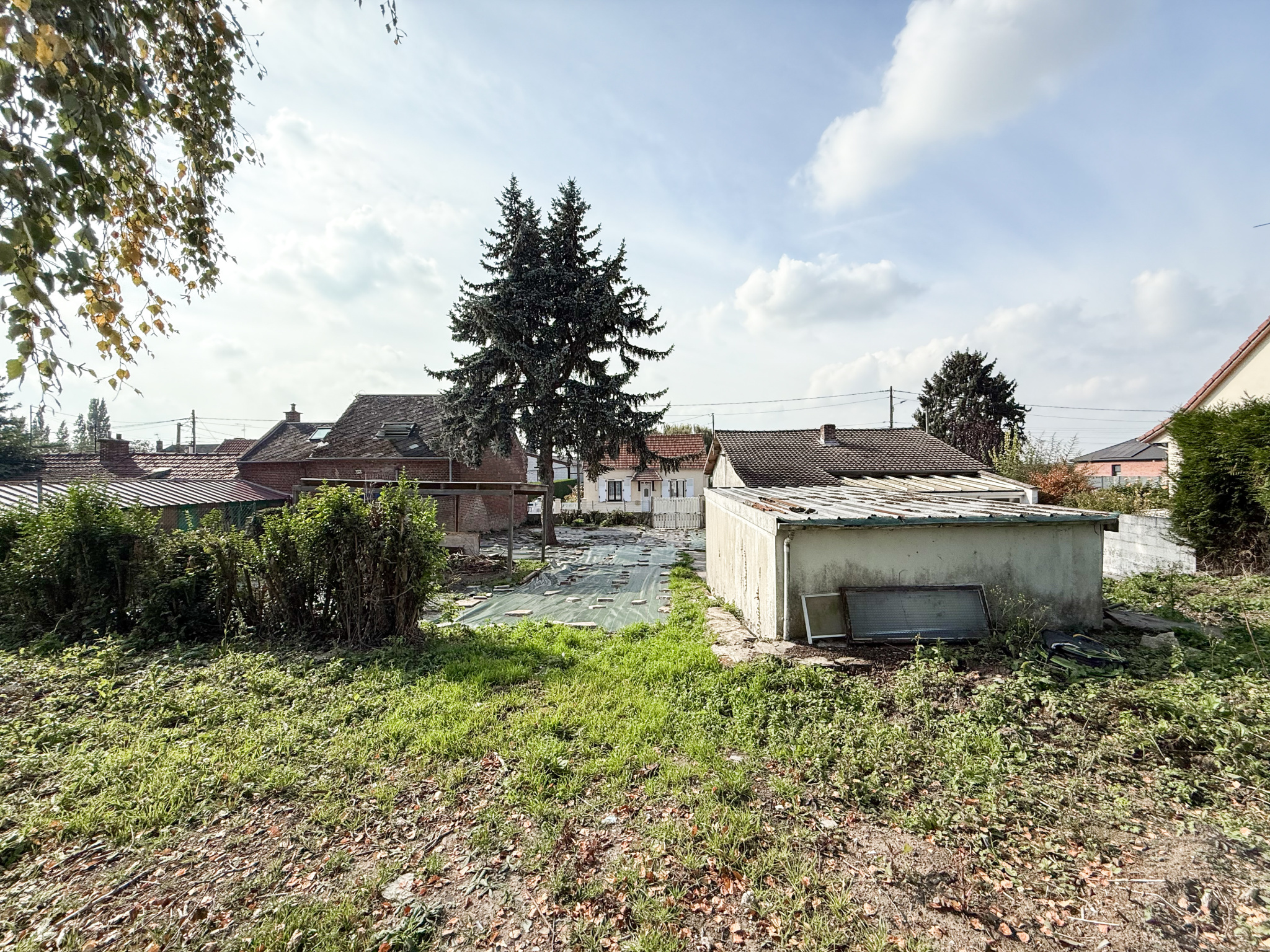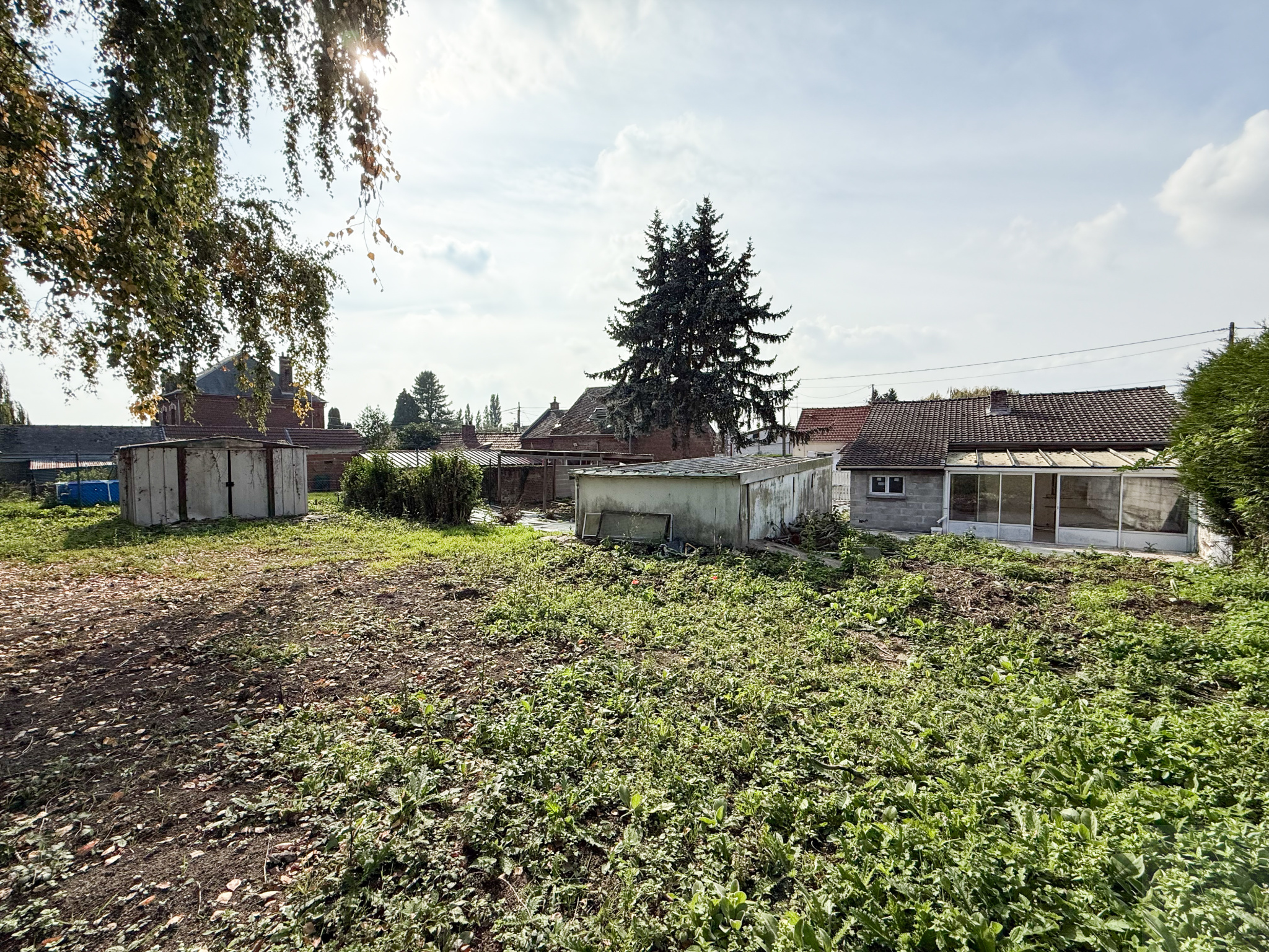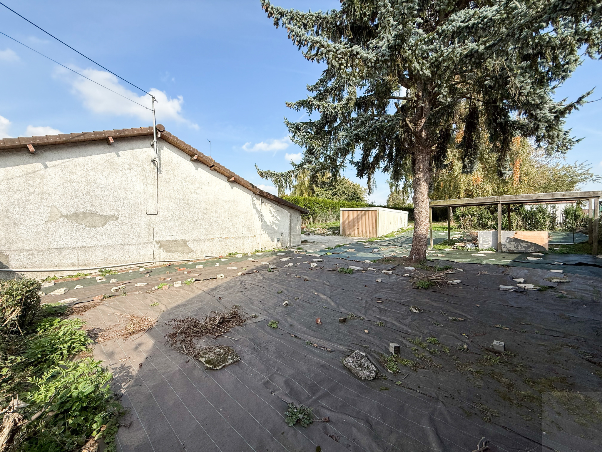 Extérieur : un jardin clos et arboré avec un garage