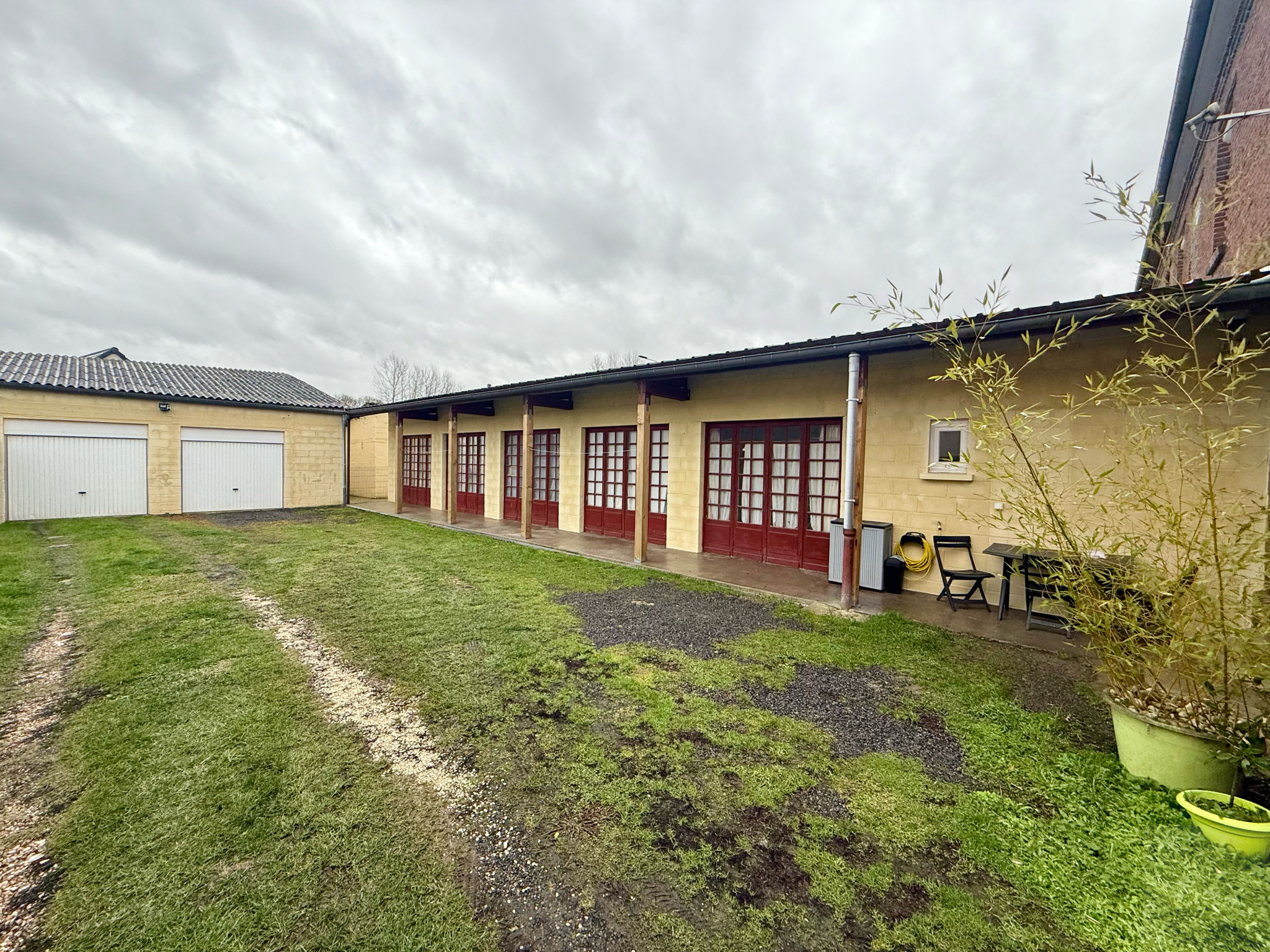 Extérieur : un jardin clos et arboré, une salle des fêtes de 108 m², deux dépendances de 5 m² et 6 m², et deux garages d’une surface de 33 m².